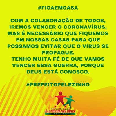 Atenção população de São Pedro da Água Branca, fique em casa, a permanência de todos em suas residências será crucial nos próximos dias para evitarmos a propagação e disseminação em nossa cidade do Coronavírus. Ficar em casa e evitar o contato com aglomerações de pessoas é a forma mais simples de se proteger. Pedimos a todos que encarecidamente sigam as orientações dos profissionais de saúde e obedeçam as determinações das autoridades constituídas pela legislação em vigor. Precisamos da ajuda de todos para vencermos esta guerra contra o Coronavírus. Por favor, fiquem em casa.
